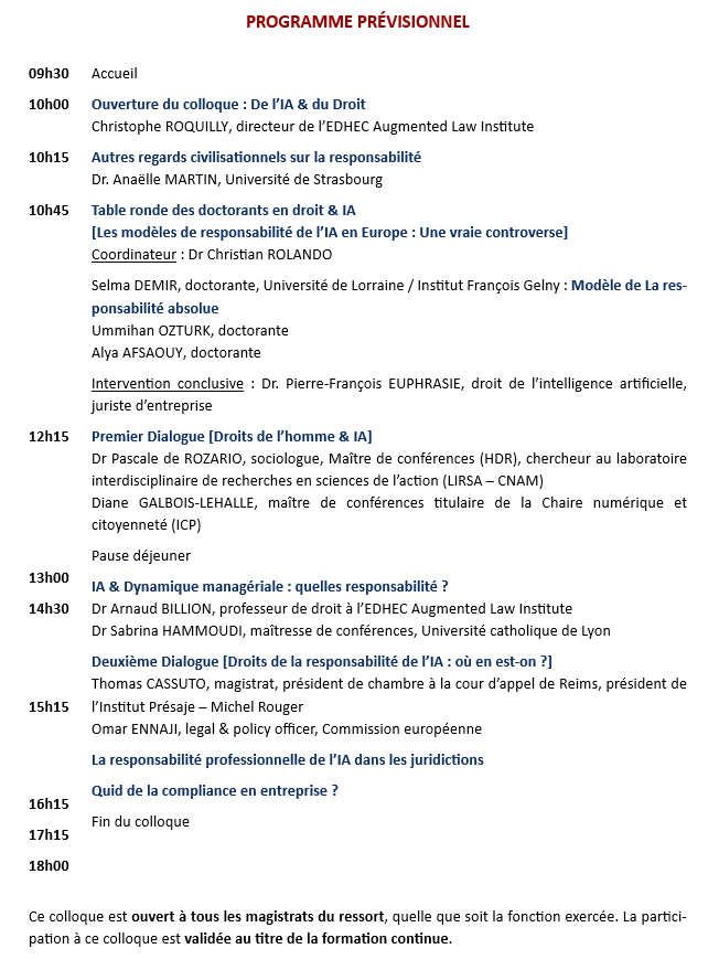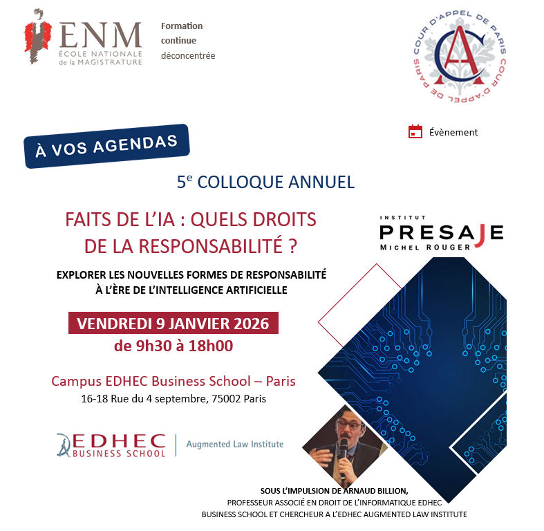 5ème colloque annuel Présaje / Cour d'Appel de Paris. L’IA (dispositifs informationnels en réseau) produit des effets indéniables aux plans social et technique, faits que le juriste voudra qualifier notamment au regard du droit de la responsabilité. Continuité d’internet en version dite « intelligente », les propositions d’IA (américaines, chinoises…) ont entraîné l’Europe à multiplier – trop vite ? – les instruments de régulation (RGPD, DSA, DMA, RIA…). Sans cadre unifié aujourd’hui pour traiter les questions de responsabilité juridique liées à l’IA. Le retrait récent du projet de Directive sur l’adaptation du droit civil à l’IA semble ouvrir une opportunité : celle de repenser les modèles juridiques disponibles pour comprendre et encadrer l’IA dès lors que ces dispositifs nuisent aux droits de l’homme, socle juridique européen (droit à une procédure, droit d’expression…). Ce colloque interdisciplinaire interroge les modèles existants de responsabilité – individuelle, collective, systémique – et les articulations entre responsabilité juridique et responsabilité sociétale. En croisant les regards d’universitaires, de magistrats, d’avocats, de responsables conformité et d’éthiciens, il s’agira de comprendre comment le droit peut (re)prendre prise sur les chaînes de décision automatisées et sur les effets concrets de l’IA dans nos sociétés.