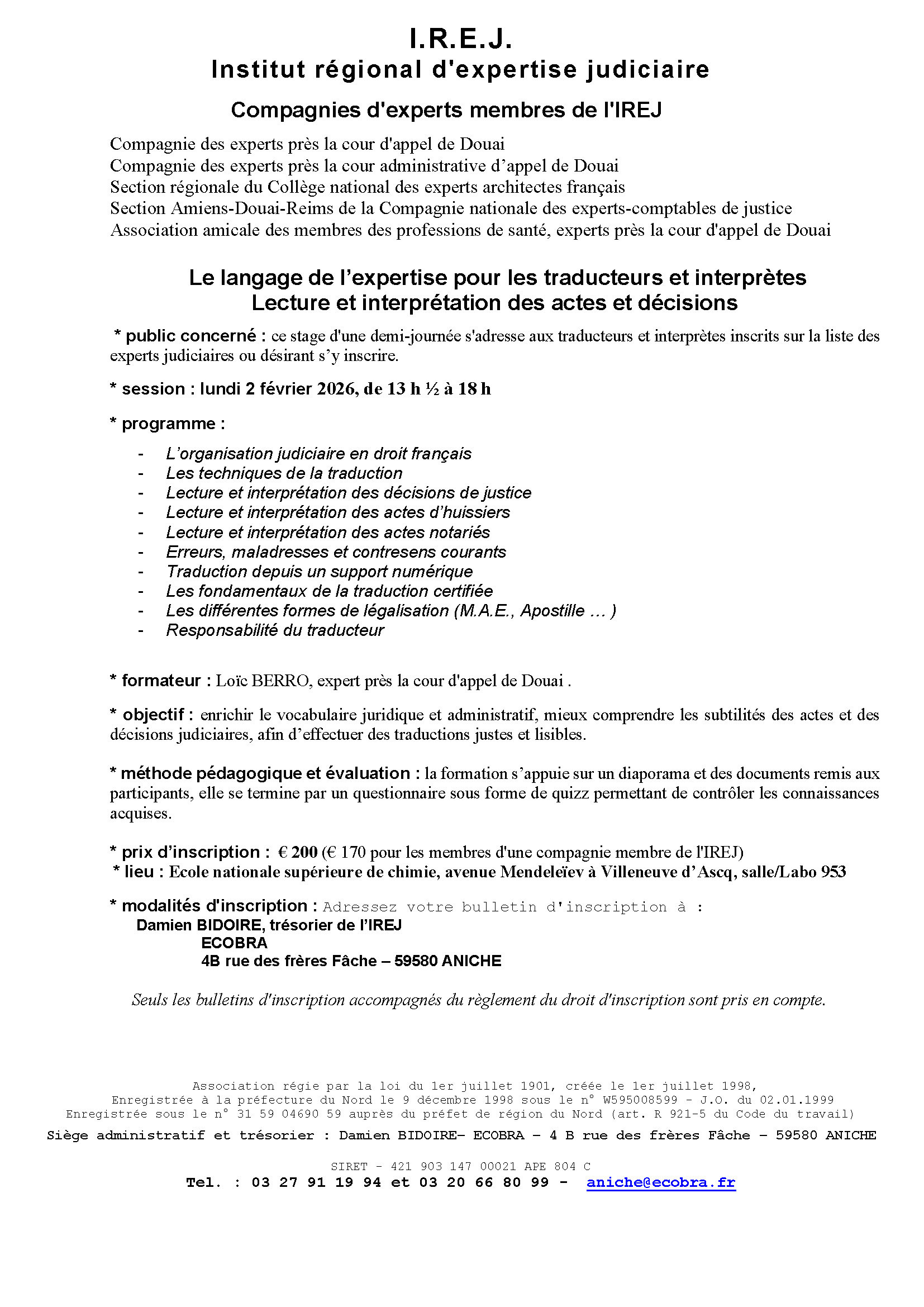 Ce stage d'une demi-journée s'adresse aux traducteurs et interprètes inscrits sur la liste des experts judiciaires ou désirant s’y inscrire. Cette formation a pour objectif d'enrichir le vocabulaire juridique et administratif et mieux comprendre les subtilités des actes et des décisions judiciaires, afin d’effectuer des traductions justes et lisibles. Contact et inscriptions : Pour accéder au programme et vous inscrire à cet évènement, cliquer ici |